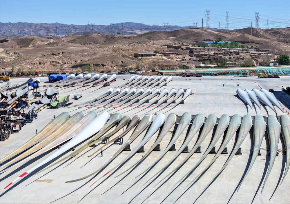 2024年5月11日拍摄的码放在内蒙古包头市石拐区一家风电设备制造企业厂区内的叶片(无人机照片)。新华社记者连振摄