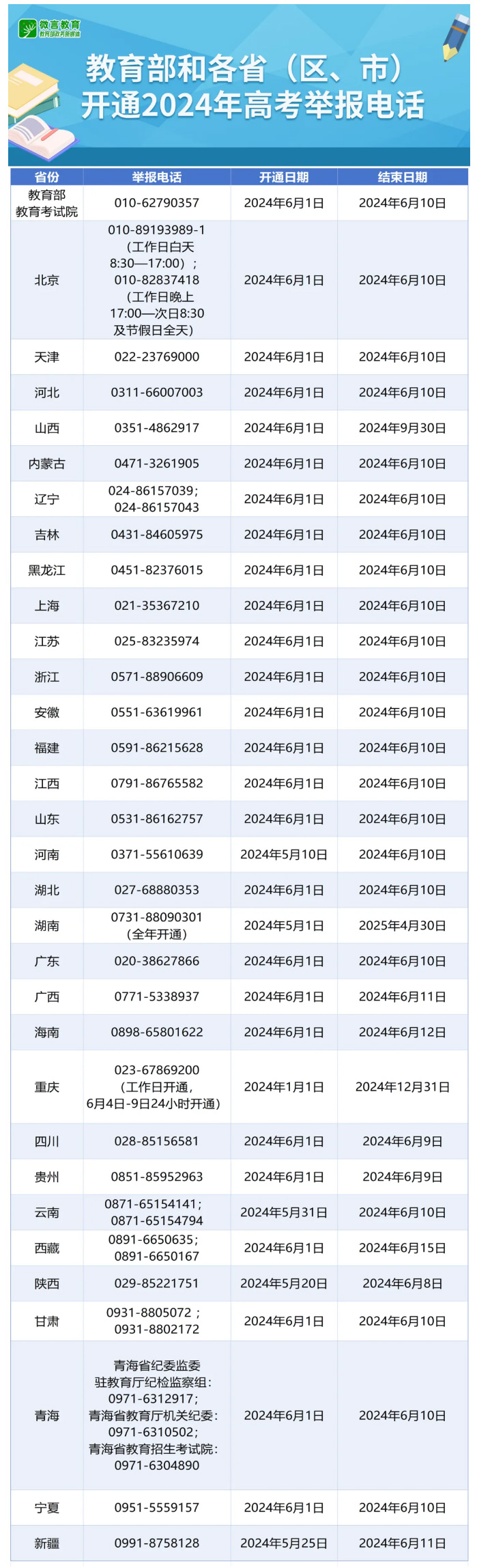 近日,教育部统一公布了教育部以及各省(区、市)2024年的高考举报电话,欢迎广大考生、家长及社会各界人士及时举报反映涉及2024年高考的问题线索。教育部及各省(区、市)将会同有关部门根据举报线索第一时间核查处理,坚决维护高考公平公正。