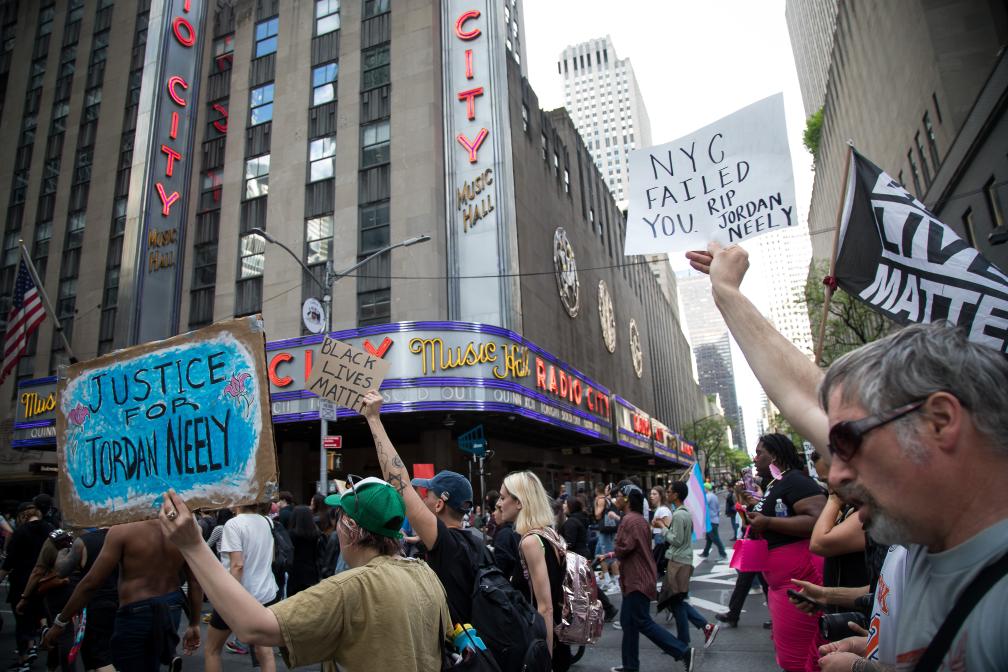 美国纽约市的无家可归黑人男子乔丹·尼利2023年5月1日在地铁遭白人男子丹尼尔·潘尼扼喉身亡,当地警方对潘尼进行问询后于当天将其释放,引发纽约民众持续抗议。图为同年5月6日在纽约拍摄的抗议现场。新华社发(郭克摄)