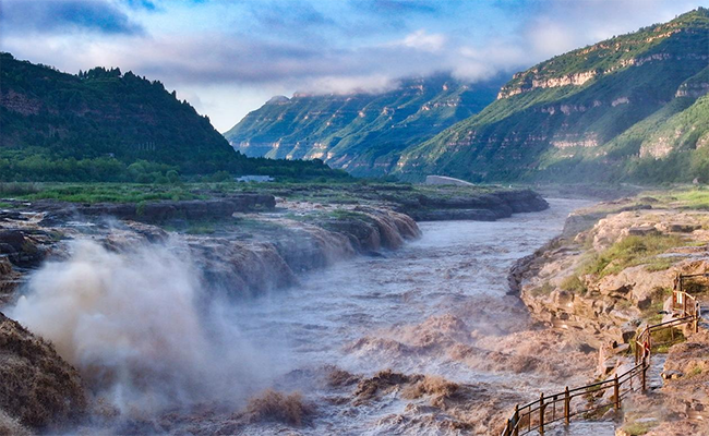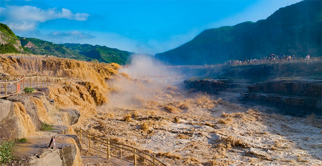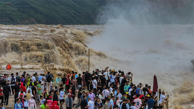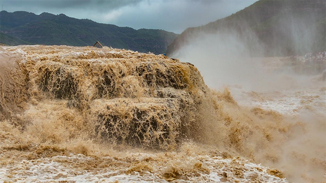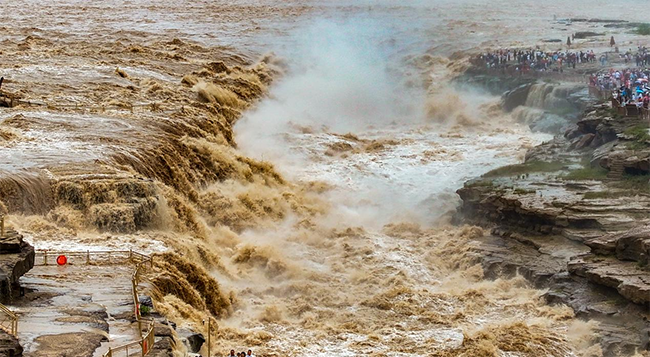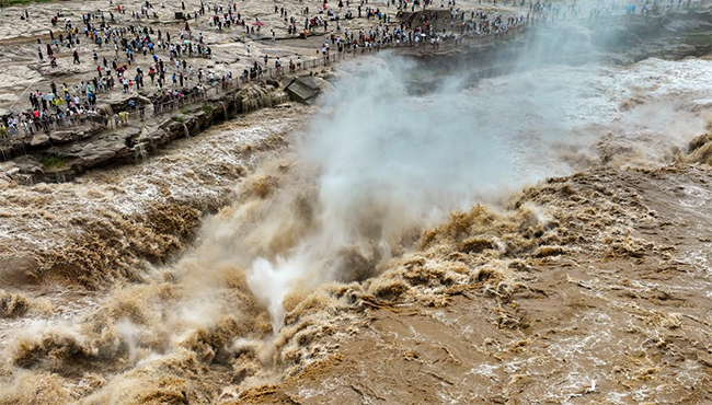 近期,由于上游降雨,河水暴涨,位于秦晋大峡谷的黄河壶口瀑布水量增加,形成延绵数百米的瀑布群景观,蔚为壮观。(赵晓罡)
