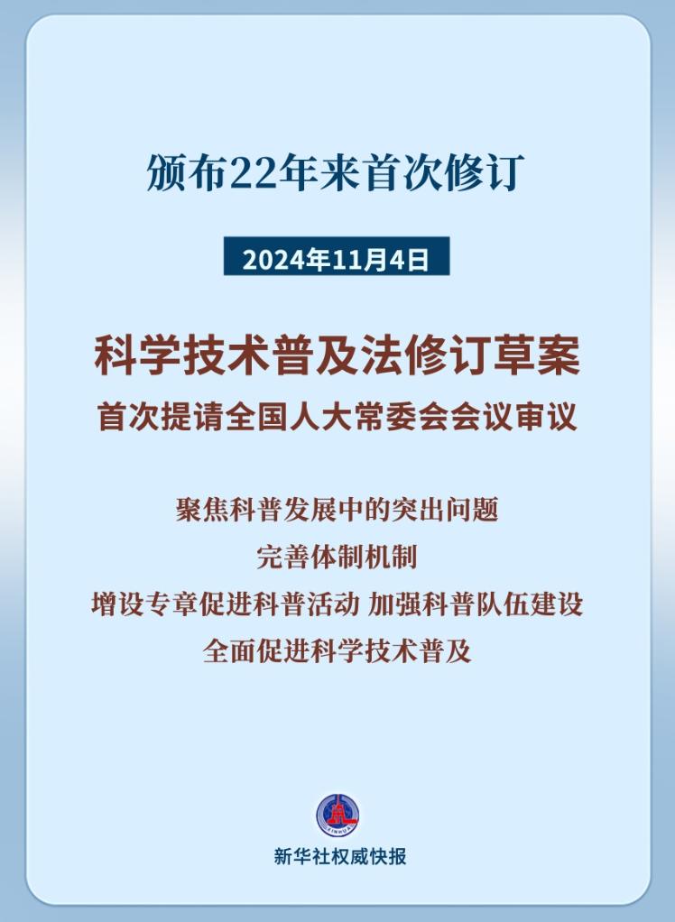 科学技术普及是实现创新发展的重要基础性工作。11月4日,科学技术普及法修订草案首次提请全国人大常委会会议审议,这是科学技术普及法自2002年公布施行以来首次修订。
