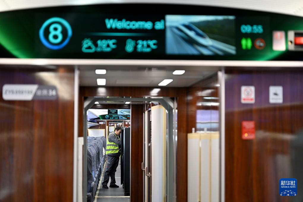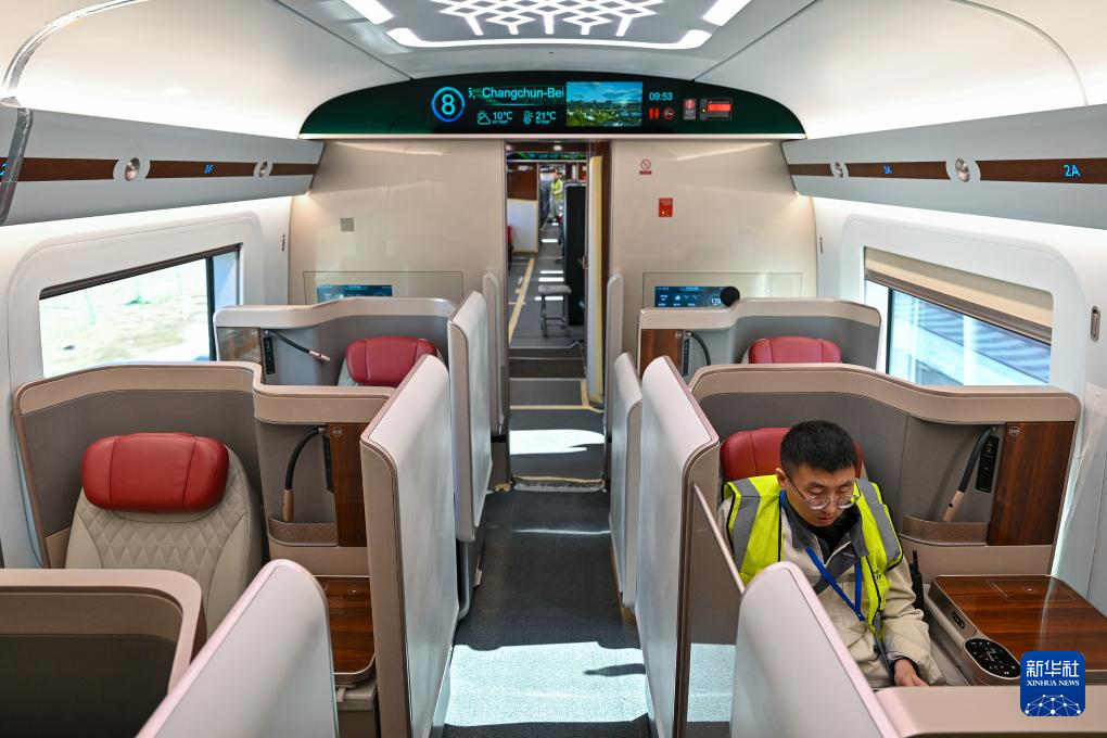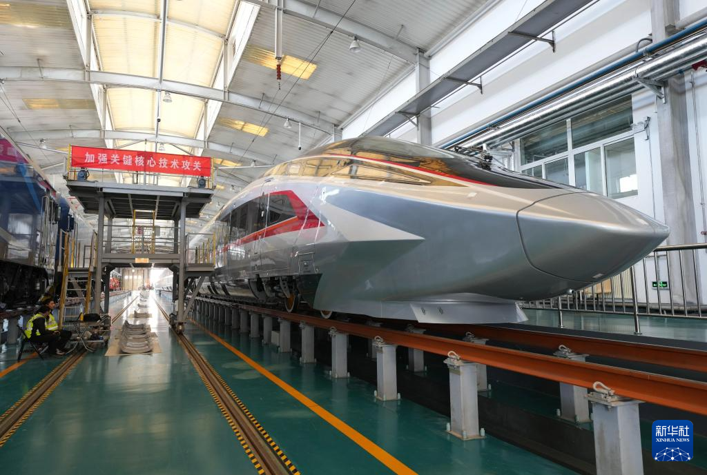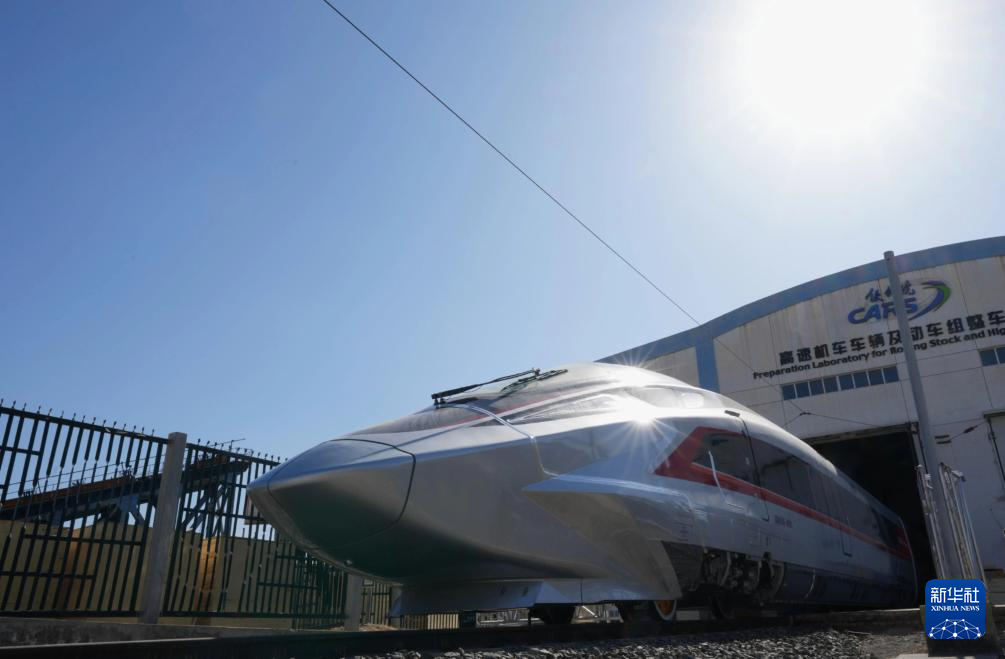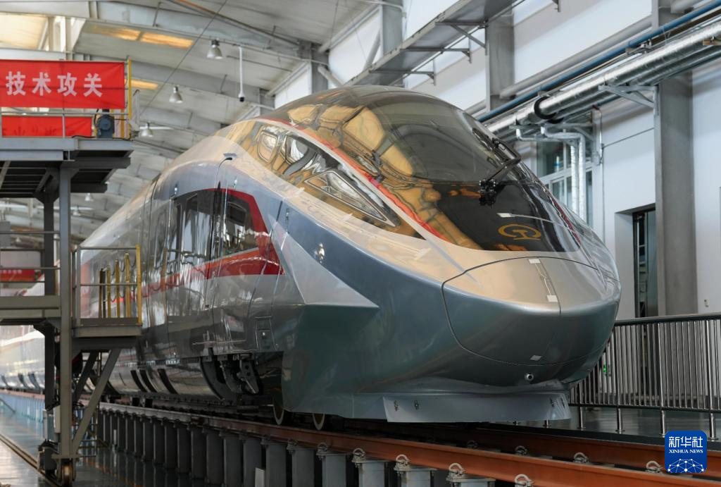 近日,运营时速400公里的高铁列车CR450动车组样车在北京发布。目前相关团队正在开展一系列科学试验和性能验证,为动车投入商业运营创造条件。 新华社记者 邢广利 摄