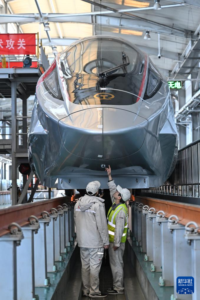 2月25日,工作人员在铁科院国家铁道试验中心对CR450动车组样车进行试验验证。