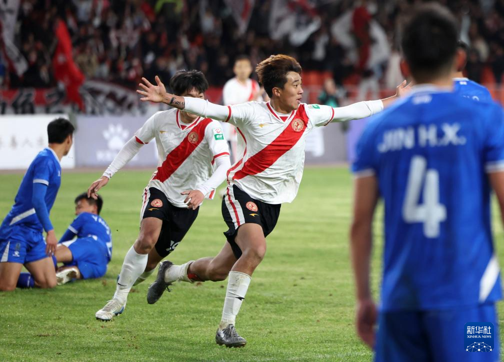 3月23日,兰州陇原竞技队球员杨胜茗在破门得分后庆祝。新华社记者 陈斌 摄