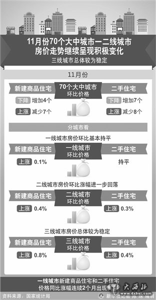 国家统计局数据显示,11月份全国热点城市房价趋稳,其中京沪深止涨,未来部分城市房价水平将继续回落。另据易居研究院数据显示,三线城市楼市转暖,11月份新建商品住宅成交面积同比增长52%。