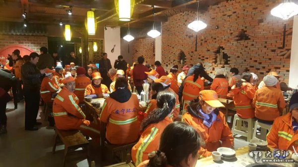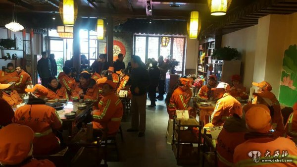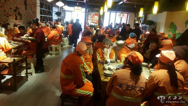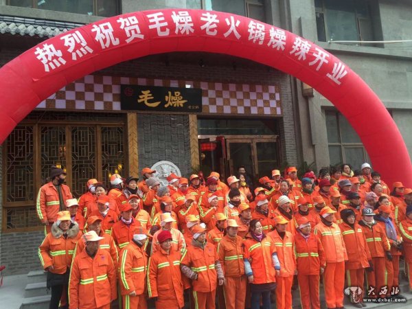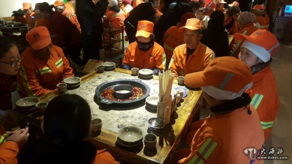 大西北网讯 时值三九隆冬。昨日,在兰州市安宁区一家新开的老派成都口味的火锅店内热气腾腾、人声鼎沸,近百余名环卫工身着橙色工作服,在这个寒冷的冬天聚集在这家“毛躁老火锅”店内,免费品尝热气腾腾的火锅。