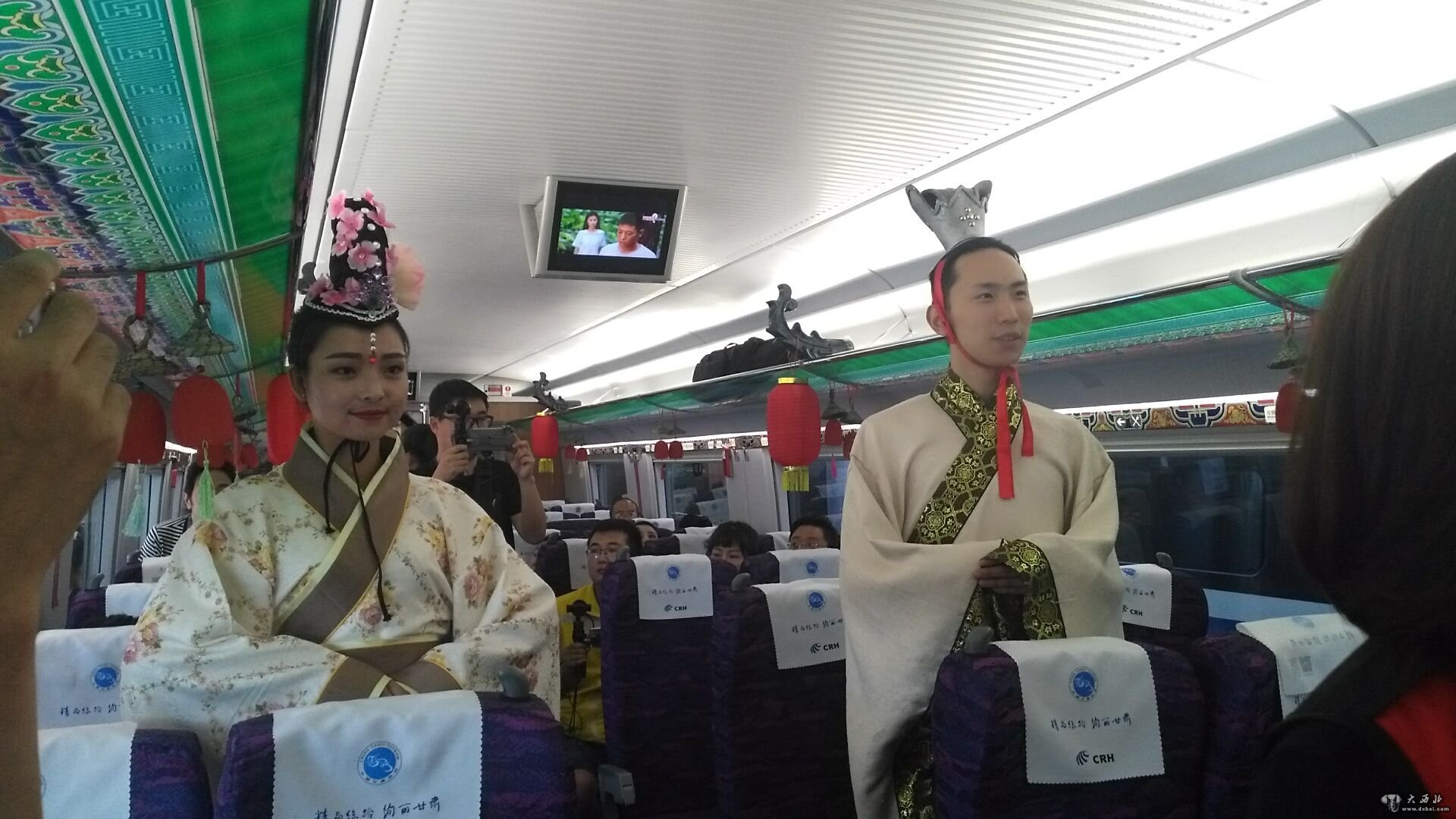 我们在列车商务座过道服务台上配备现磨咖啡、特色饮品,为乘车旅客提供休闲需求。在车厢内采用浮雕、房檐造景和悬挂风铃木牌的方式,营造浓郁、庄重、多彩的伏羲文化氛围,通过粘贴薰衣草、山丹军马场等本地特色风景照,展示塞上甘州迷人景观。动车上的装饰布置还以关城造景、“烽火台”造景、驼队胡杨林贴画以及沙漠黄地毯,让乘车旅客360度无死角的置身于大漠戈壁之中,直观感受雄关魅力。