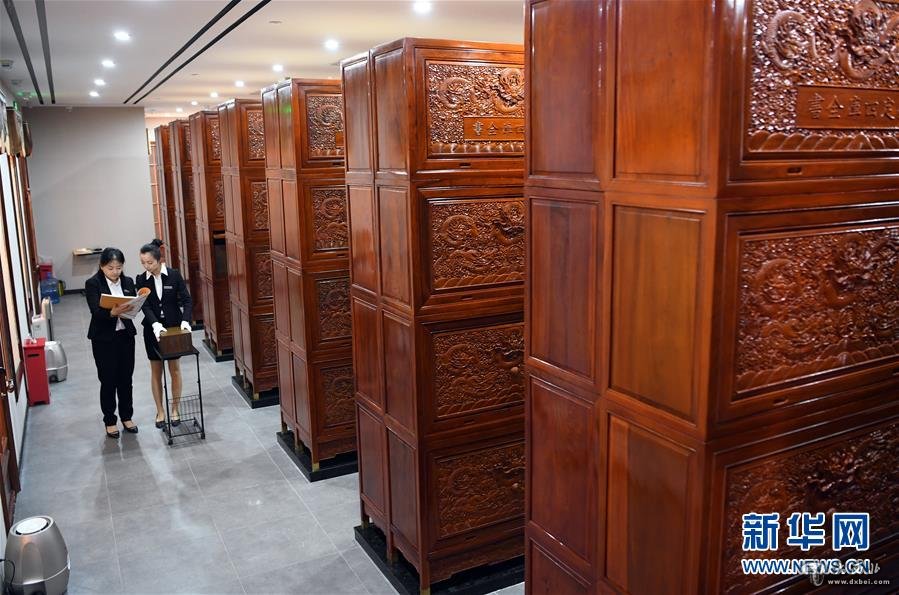 在甘肃天庆博物馆,工作人员整理影印本文渊阁《四库全书》藏书柜(4月20日摄)。