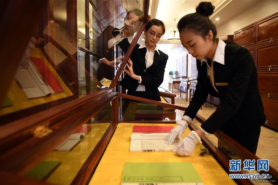 在甘肃天庆博物馆,博物馆工作人员刘妤(右)整理展柜中的影印本文渊阁《四库全书》(4月20日摄)。