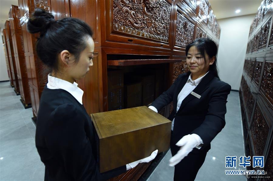 在甘肃天庆博物馆,博物馆副馆长赵婵婵(右)和工作人员刘妤整理影印本文渊阁《四库全书》藏书柜(4月20日摄)。