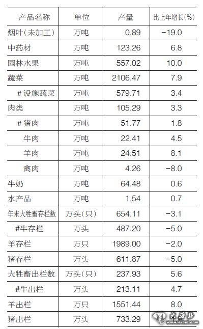 主要经济作物中,蔬菜产量2106.47万吨,比上年增产7.9%,其中设施蔬菜产量579.71万吨,增产3.4%;园林水果产量557.02万吨,增产10.0%;中药材产量123.26万吨,增产6.8%。