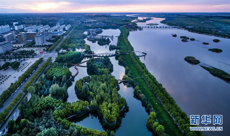夕阳西下时的高台国家城市湿地公园(9月7日无人机拍摄)。