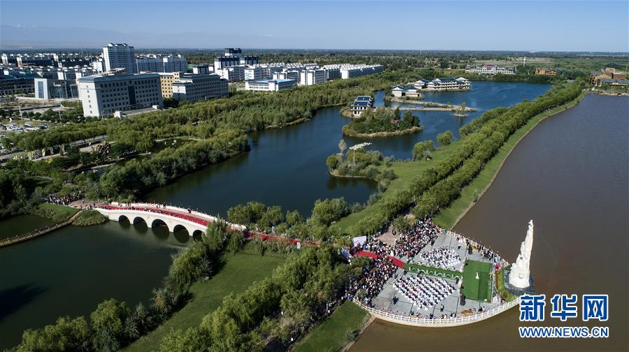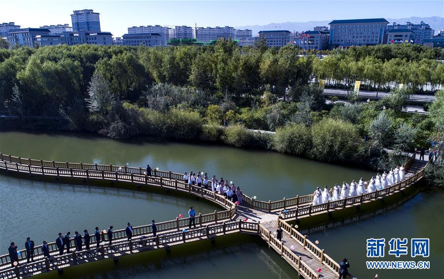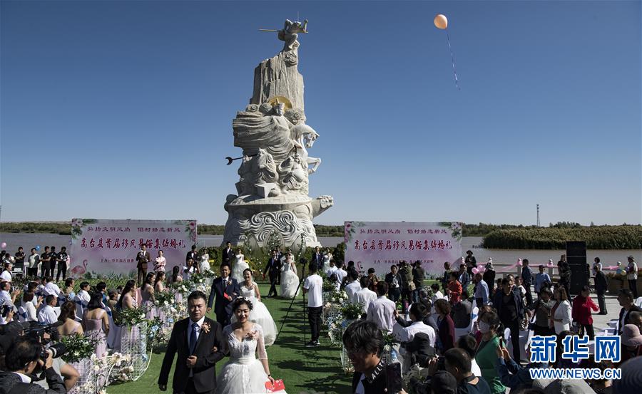 9月7日,高台县的12对新人在高台国家城市湿地公园举办集体婚礼。