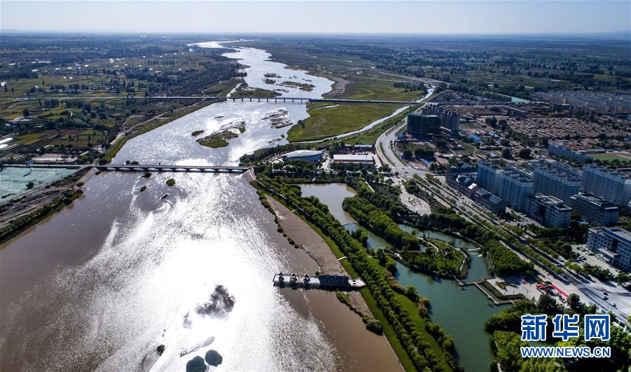高台县黑河湿地与高台县城连为一体,成为当地独特的风景(9月7日无人机拍摄)。