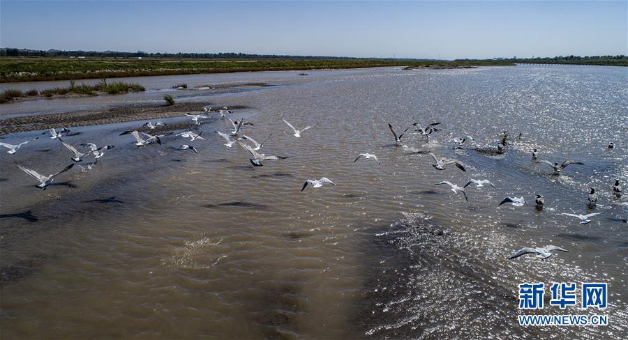 9月7日,一群鸟儿在高台县黑河湿地栖息(无人机拍摄)。
