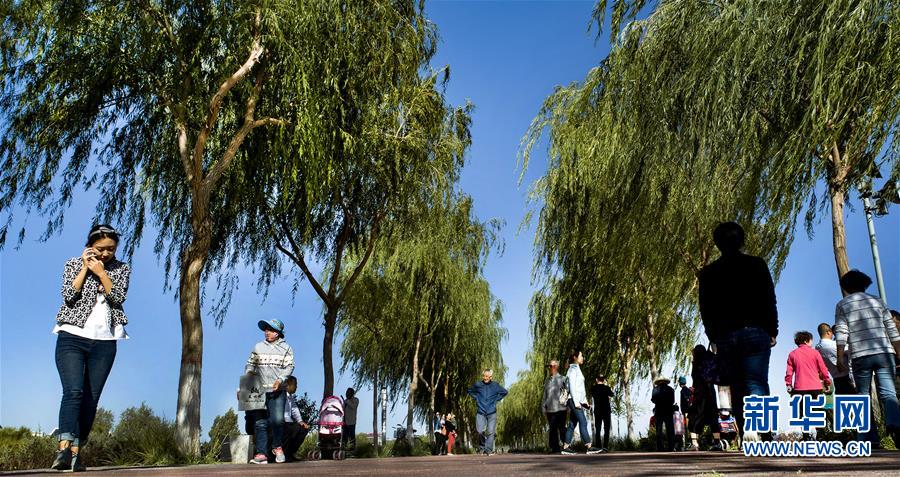 9月7日,高台县城的居民在黑河湿地护岸堤上休闲。