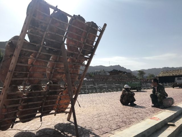 龙湾村的筏子客正在晾晒羊皮筏子。新华社记者程楠摄