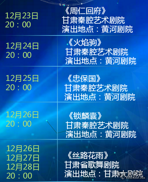 据悉,此次演出由甘肃省委宣传部、省文化和旅游厅主办,甘肃演艺集团承办,以“演艺经典,乐享艺术”为主题,共演出11场,包括大型经典舞剧《丝路花雨》,大型秦腔传统剧《周仁回府》《火焰驹》《忠保国》,大型新编秦腔《锁麟囊》,儿童剧《小猪快跑》《阿拉丁和神灯》《小蝌蚪找妈妈》等。