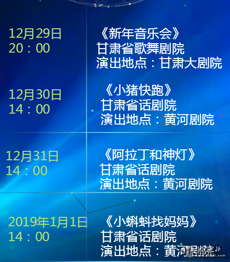 为纪念改革开放40周年,迎接2019年新年,甘肃省2018年12月23日至2019年1月1日在兰州举办“庆祝改革开放40周年——元旦惠民演出”活动。