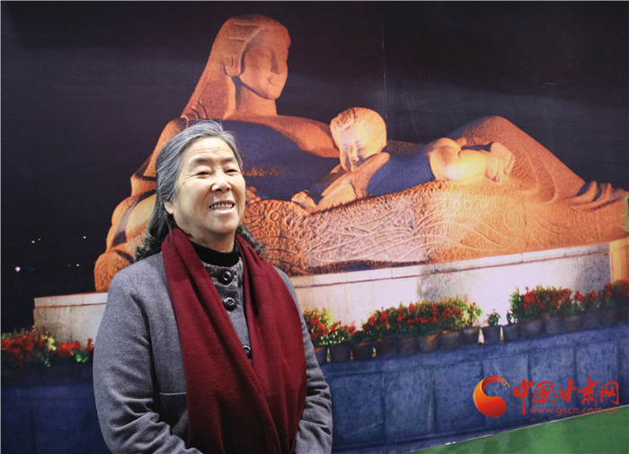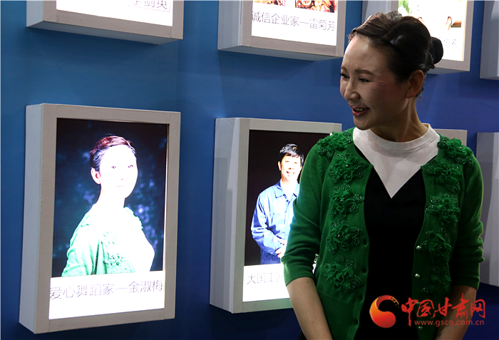 金淑梅,她的身后就是展览陇原先锋的系列照片,她就在其中。
