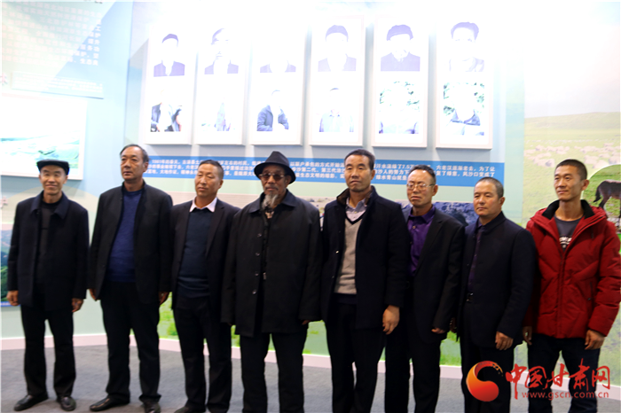 古浪八步沙三代治沙人,他们身后是“六老汉”事迹专题展板。