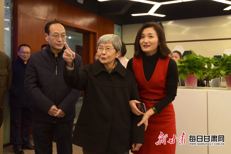 下午3时许,敦煌研究院名誉院长樊锦诗来到甘肃新媒体集团。一进门,和蔼可亲的她向工作人员挥手问候;来到全媒体中心指挥大厅,在甘肃日报社、甘肃新媒体集团领导的陪同下,樊锦诗观看了甘肃新媒体集团宣传片。当新媒体集团的标识“九色鹿”图标在巨大的显示屏上出现时,樊锦诗的脸上露出了笑容,“这不是敦煌壁画上的图案吗?把九色鹿作为标志,很有创意。”