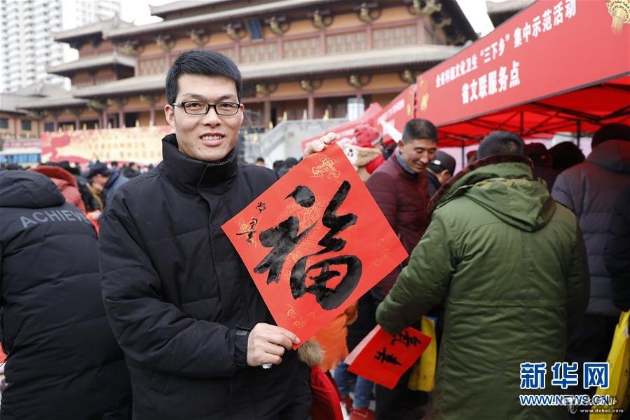 1月15日,在静宁县成纪广场,市民在展示福字。