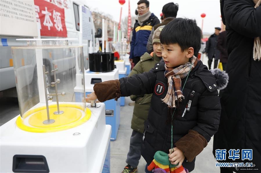 1月15日,在静宁县成纪广场,小朋友在体验科普装置。