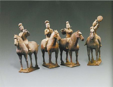 彩绘吹排箫、弹琵琶、吹笛、击鼓俑唐代(公元618年-907年)