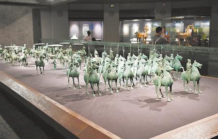 甘肃省博物馆展厅中的铜车马出行仪仗俑。