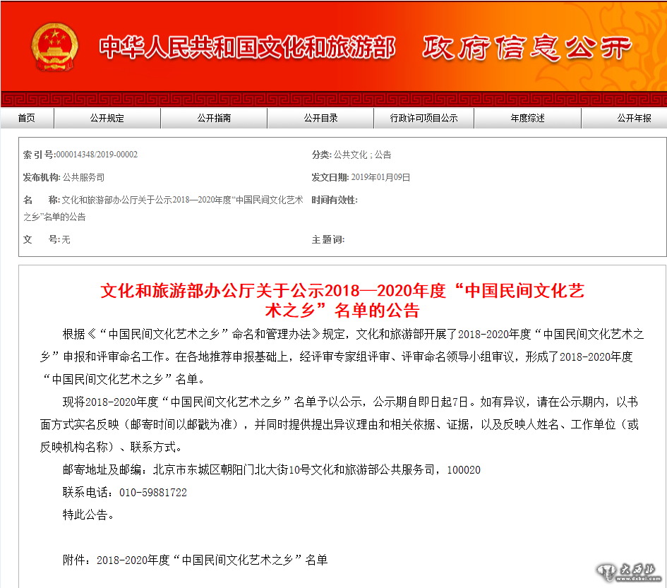 现将2018-2020年度“中国民间文化艺术之乡”名单予以公示,公示期自即日起7日。如有异议,请在公示期内,以书面方式实名反映(邮寄时间以邮戳为准),并同时提供提出异议理由和相关依据、证据,以及反映人姓名、工作单位(或反映机构名称)、联系方式。