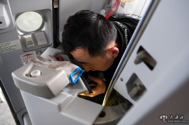 1月17日,在东航技术甘肃分公司,检修人员检修飞机客舱舱门。新华社记者范培珅摄
