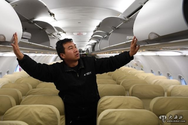 1月17日,在东航技术甘肃分公司,检修人员检查客舱行李架盖。新华社记者范培珅摄