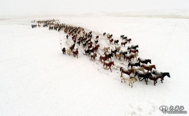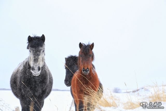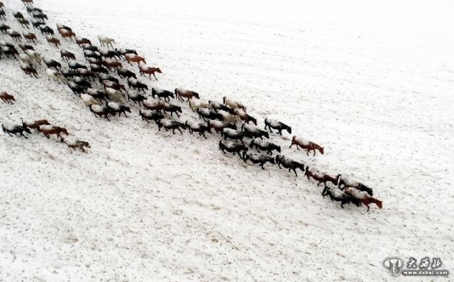 近日,甘肃省张掖市山丹县迎来降雪天气,山丹马场鸾鸟湖千里冰封,马群、牛羊点缀着草原,构成一幅冬季高原美景。新华社发(王超 摄)