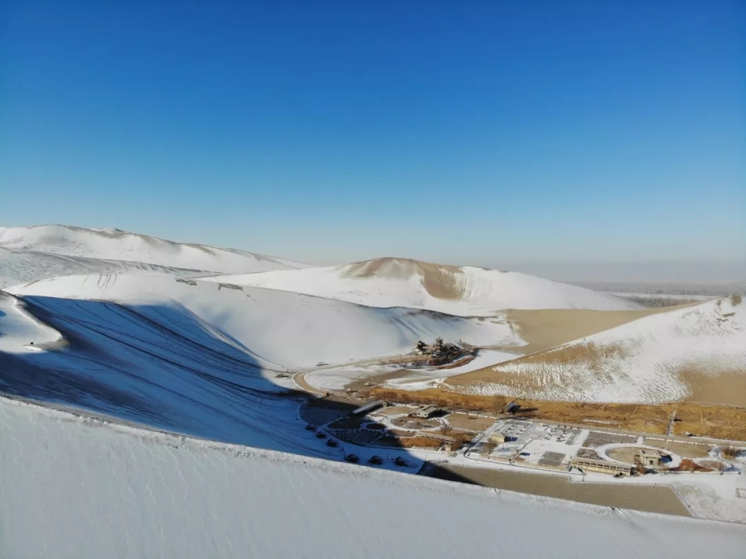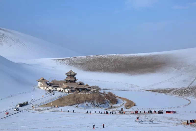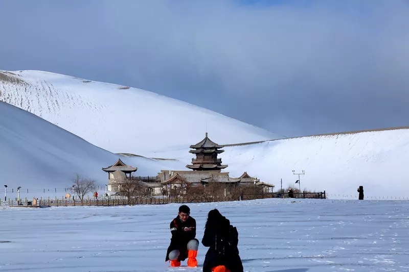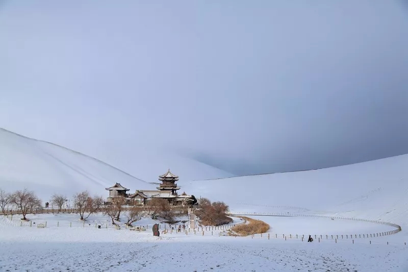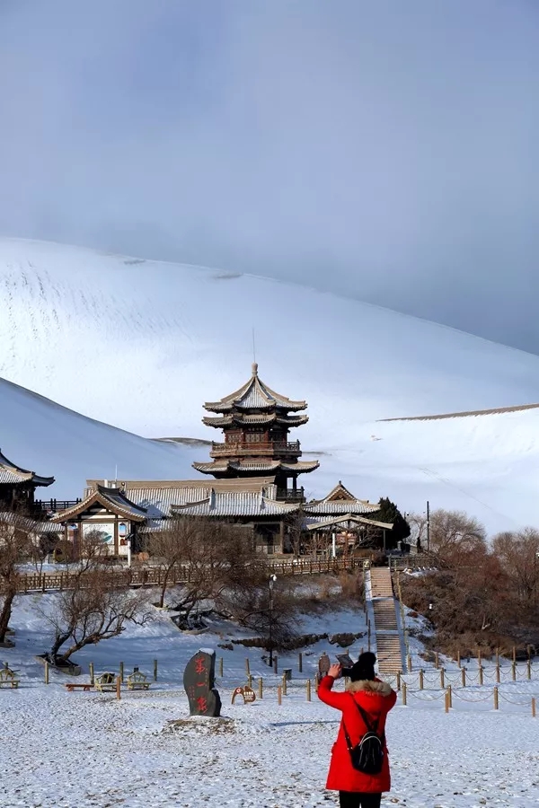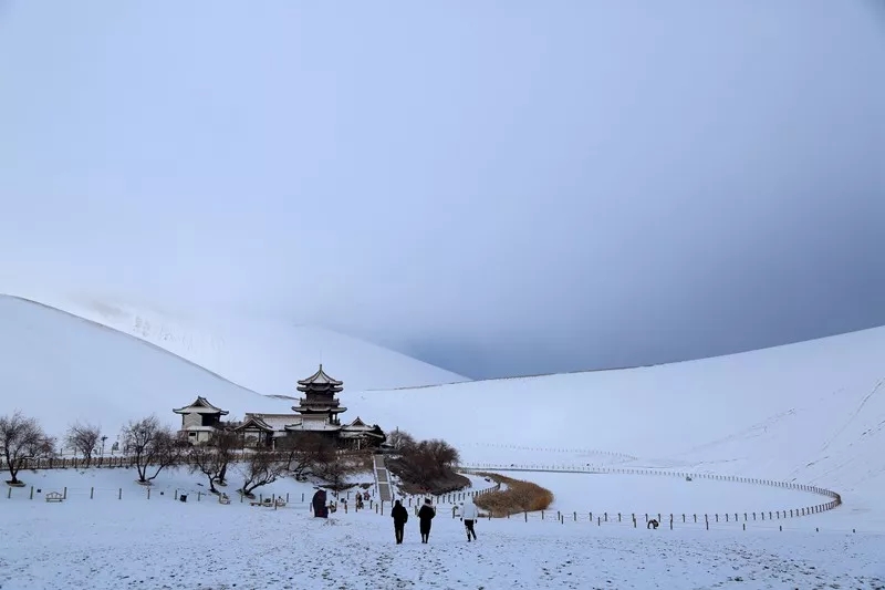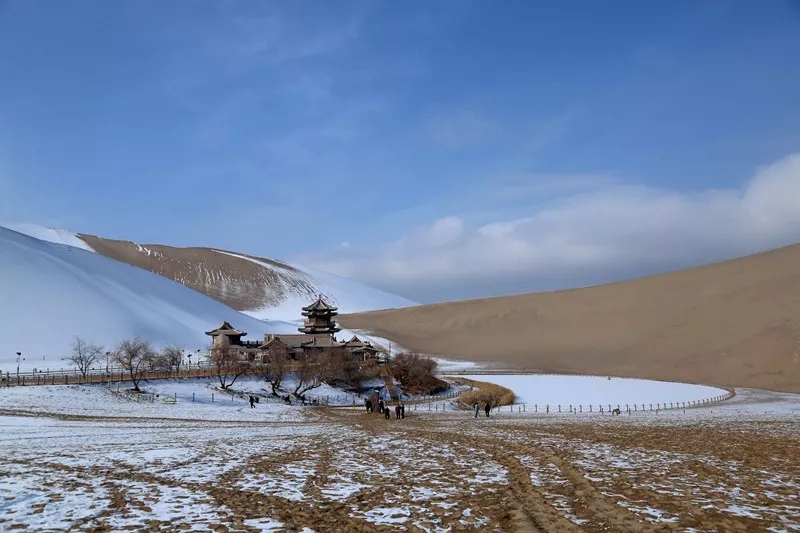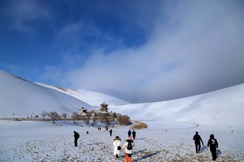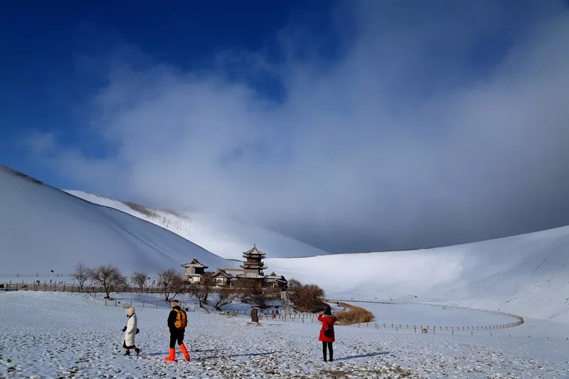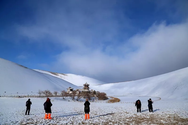 雪后的敦煌市鸣沙山月牙泉景区银装素裹,景色如画,吸引不少游客前来欣赏大漠雪景,体验丝路风情。