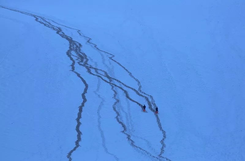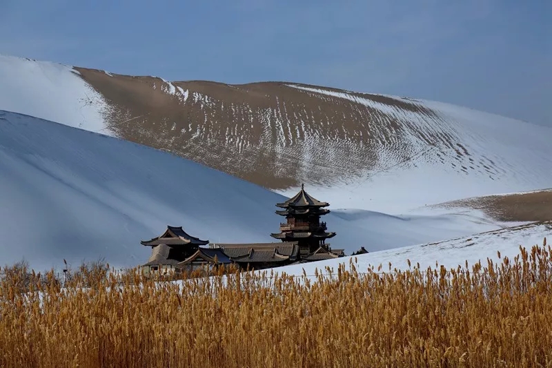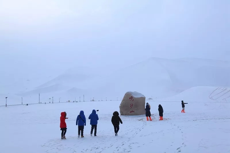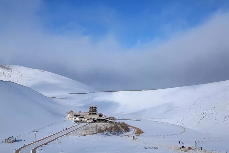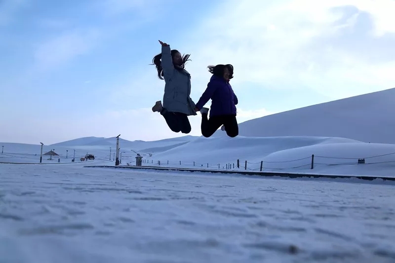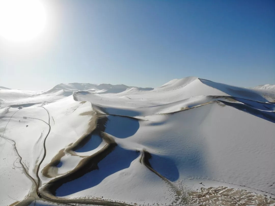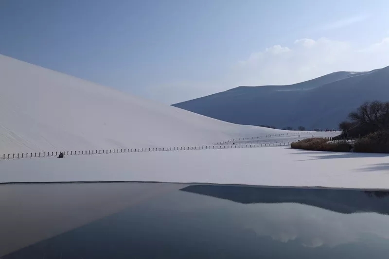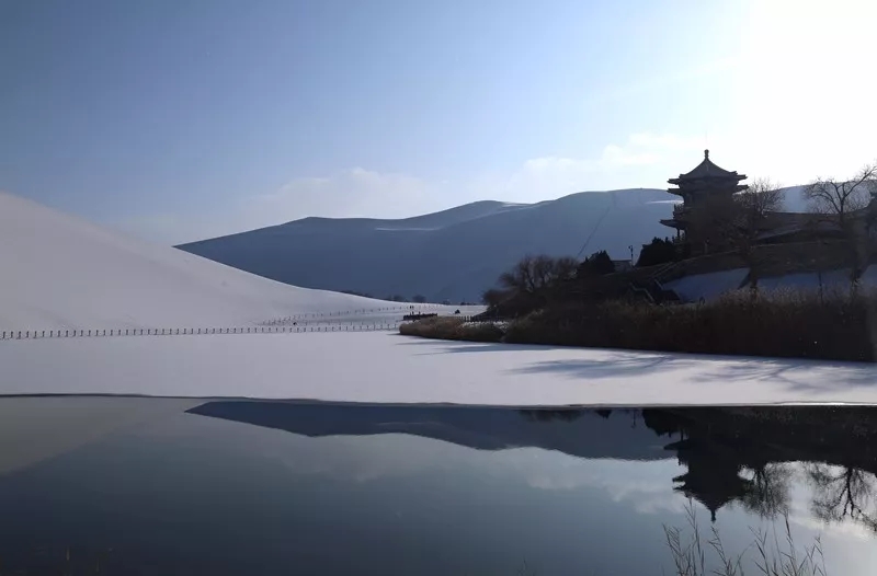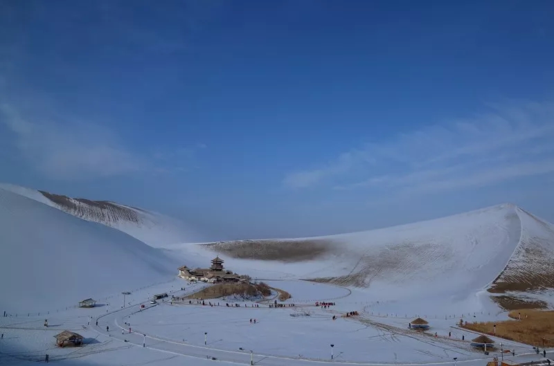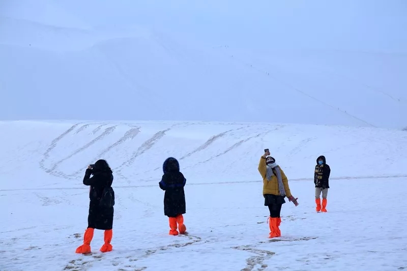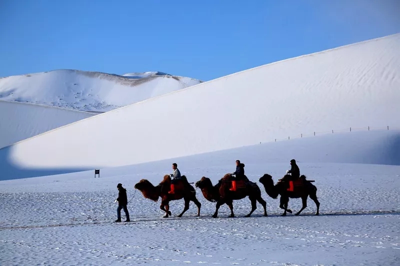 雪后的敦煌市鸣沙山月牙泉景区银装素裹,景色如画,吸引不少游客前来欣赏大漠雪景,体验丝路风情。
