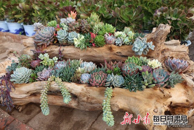 采访中记者发现,在众多多肉植物中,一块摆在铁架上的枯木十分惹眼:枯木上有个腐蚀的大洞,被清洗得十分干净,腐蚀后留下的别样造型也有一种特别的美感。问及这件作品的创意,贺建新告诉记者:“枯木是他无意间捡回来的,清洗后搭配多肉植物,上边组合有千佛手、秀妍、玉坠、黄丽、红宝石、白牡丹等多种植物。”经过巧手“创作”,整件作品看上去很是清丽、可爱。