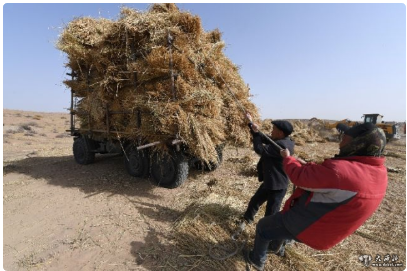 在甘肃省古浪县境内的黑岗沙风沙口,八步沙第二代治沙人郭万刚(左)用绳索固定车辆上的压沙稻草(3月26日摄)。新华社记者范培珅摄