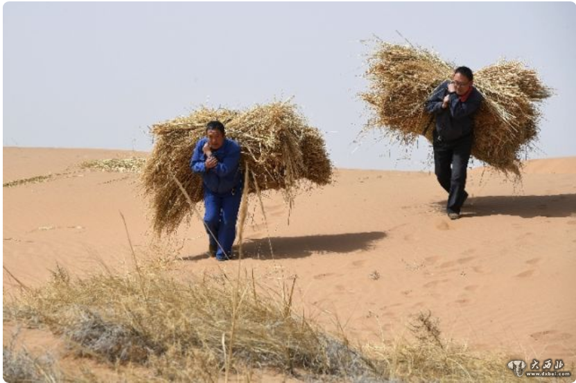 在甘肃省古浪县境内的黑岗沙风沙口,八步沙第二代治沙人程生学(右)、王志鹏(左)往压沙点转运压沙稻草(3月26日摄)。新华社记者范培珅摄