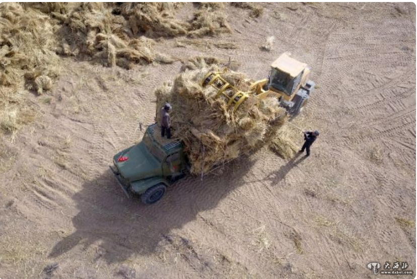 在甘肃省古浪县境内的黑岗沙风沙口,八步沙第二代治沙人郭万刚(右)指挥装载机往车辆上装载压沙稻草(3月26日无人机拍摄)。新华社记者范培珅摄