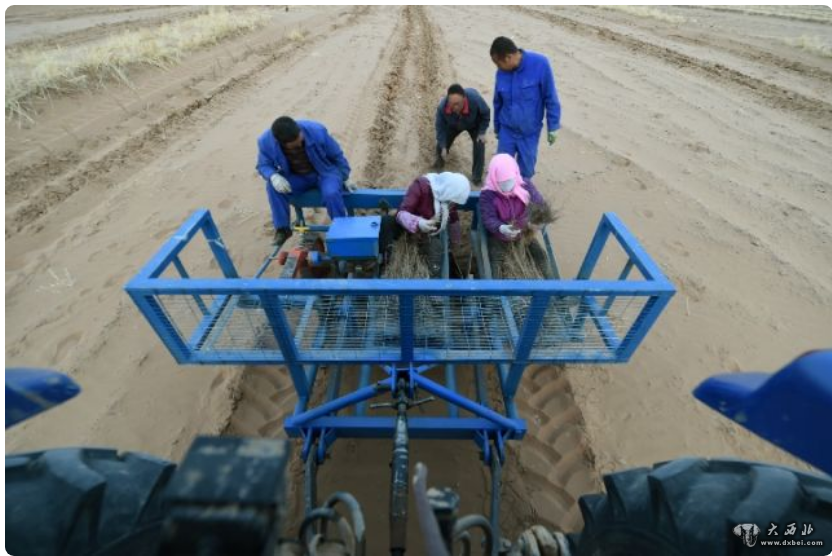 在甘肃省古浪县黄花滩移民区,八步沙第二代治沙人和村民一起使用梭梭肉苁蓉种植一体机种植梭梭嫁接肉苁蓉(3月26日摄)。新华社记者范培珅摄
