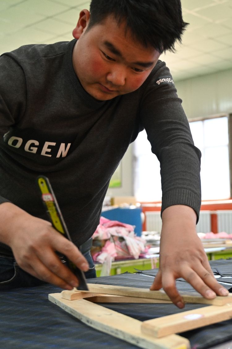 4月3日,在东乡族自治县振兴雨具扶贫车间,工人剪裁雨伞伞面材料。新华社记者马宁摄
