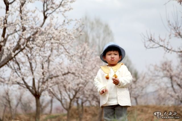 4月3日,一名儿童在东乡族自治县唐汪镇的杏花林中游玩。新华社记者李笑摄
