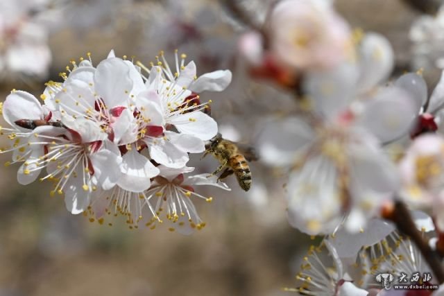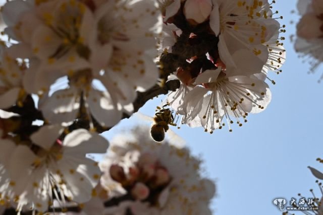 4月3日,在东乡族自治县唐汪镇的杏花林内,盛开的鲜花引来蜜蜂。新华社记者刘洁摄