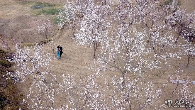 4月3日,两名游客在东乡族自治县唐汪镇观赏杏花(无人机拍摄)。新华社记者范培珅摄