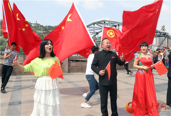 老、中、青艺术家们在人群中唱起了“兰州快板”、吹起了嘹亮的小号、激情高歌《我和我的祖国》主旋律,顿时引来中山桥广场上游客、大学生志愿者、兰州市民的热情关注。在艺术家火热的表演带动下,大学生志愿者和广场游客、市民摇动手中鲜艳的五星红旗,同来自甘肃演艺集团的青年团员们挥动国旗、团旗高唱“我和我的祖国”,霎时中山桥前红旗漫卷歌声飞扬汇聚成了红色的海洋。