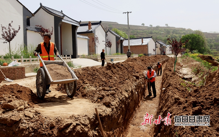 5月12日,在西峰区显胜乡毛寺村马洼组道路施工现场,挖掘机、装载机等工程车辆正在作业,工人们有的铲土、有的打夯,现场一片繁忙。