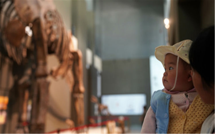 6月1日,一名女子抱着孩子在甘肃省和政县的和政古动物化石博物馆参观。新华社发(李梦馨 摄)