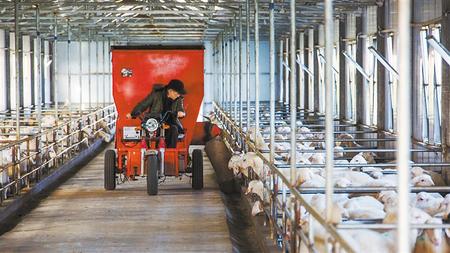 42栋羊舍,整齐划一,分两列排开。生产场长张海清大步流星,走在两列羊舍之间长长的通道上,分明是一个胸有成竹的“羊司令”。他介绍说,42栋羊舍看起来一样,其实生产舍、哺乳舍、育成舍、母羊舍、公羊舍“五舍”是分离的。而且,繁育养殖场有国内最先进的养殖机械,有以畜牧专业院校毕业生为核心的专业技术团队,实行“统一品种、统一防疫、统一饲料、统一喂饲、统一标准、统一出售”运营模式……