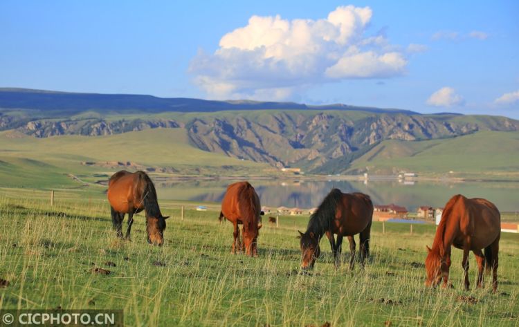 ↑6月4日,在位于祁连山下的甘肃山丹马场,成年母马在悠闲地啃食着草料。CICPHOTO/王超 摄